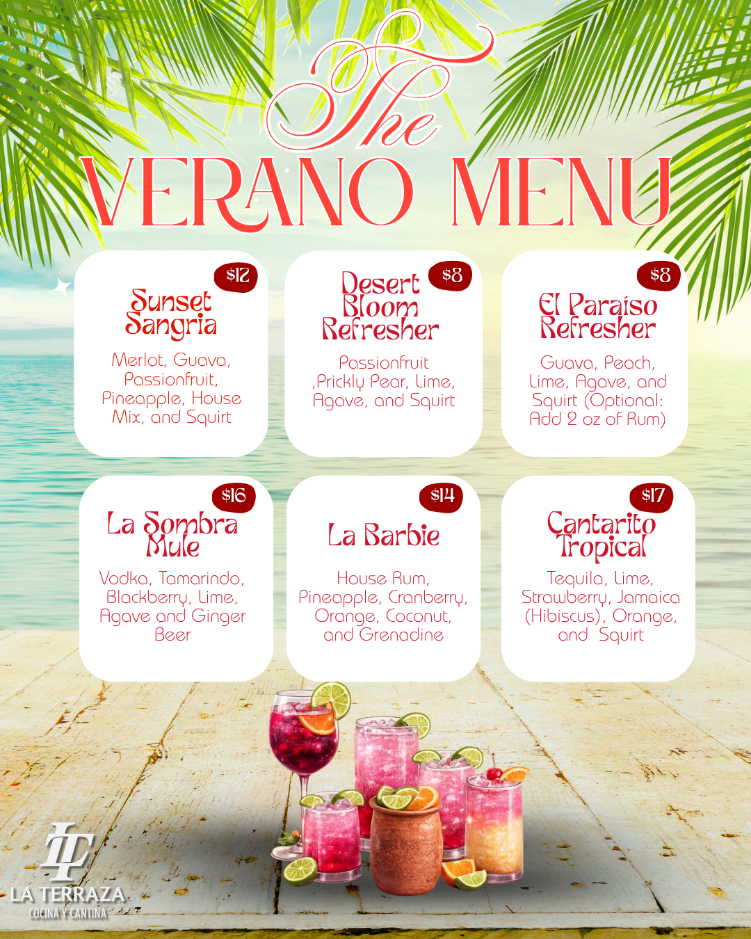 Eat Drink Visit 1027 2nd st — sacramento, ca — (916) 440 0874 VALENTINES DRINKS LIMITED TIME $12 sunset sangria Merlot, guava, passionfruit, pineapple, house mix & Sprite $12 $8 DESERT BLOOM REFRESHER Passionfruit, prickly pear, lime, agave & Sprite $8 $8 El Paraíso Refresher Guava, peach, lime, agave & Sprite $8 $16 La Sombra mule Vodka, tamarind, blackberry, lime, agave & ginger beer $16 $14 La Barbie House rum, pineapple, cranberry, orange, coconut & grenadine $14 $17 Cantarito Tropical Tequila, lime, strawberry, jamaica (hibiscus), orange & Sprite $17